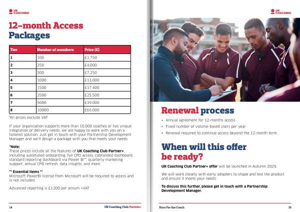 * Note: These prices include all the features of UK Coaching Club Partner +, including automated onboarding, full CPD access, cobranded dashboard, standard reporting dashboard via Power Bi **, quarterly marketing support, annual CPD refresh, data insights, and more.