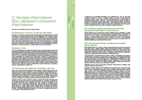 У більшості випадків інтерес наукових кіл і громадськості до проблеми гендерного насильства зосереджений на уцілілих серед жінок , їх травмах і наслідках зґвалтування ( Roosendaal , 2011 ). Менше уваги приділяють дітям , народженим в результаті таких зґвалтувань . Важливо приділити увагу цим дітям . Хоча систематичні дані відсутні , Карпентер ( 2007 ) вважає , що доступні факти вказують на те , що « діти війни » зазвичай піддаються серйозній дискримінації . Іноді тому , що матері , завагітнівши або народивши після зґвалтування , стикаються зі стигматизацією та соціальною ізоляцією . Крім того , материнська прив ’ язаність до дітей , народжених в результаті зґвалтування , істотно відрізняється в різних суспільствах , як і соціальна стигматизація таких дітей . Деяких дітей люблять і приймають , інших - відкидають як рідні матері , так і суспільство , а деякі стають жертвами дітовбивства . Різниця у ставленні , швидше за все , викликана певними відмінностями географічних , культурних і структурних обставин . Зрозуміти їх краще можна в контексті табу і міфів , які оточують подібну вагітність і дітей . Хелпери мають зрозуміти ці фактори та враховувати їх у своїй роботі .