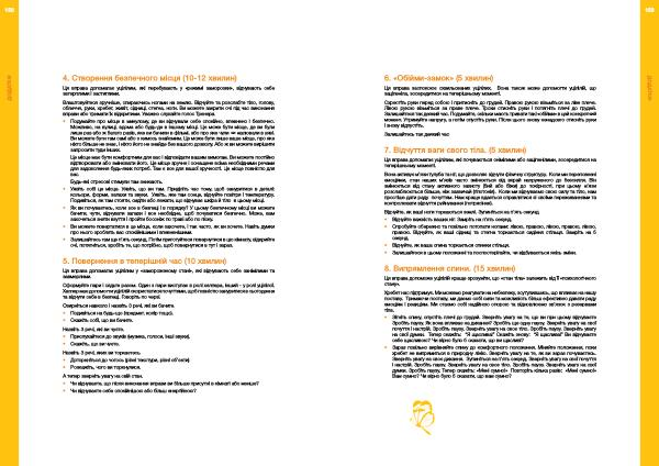 Сформуйте пари і сядьте разом . Один з пари виступає в ролі хелпера , інший - у ролі уцілілої . Хелпер має допомогти уцілілій скористатися почуттями , щоб повністю зануритися в сьогодення та відчути себе в безпеці . Говоріть по черзі .