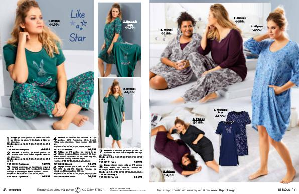 5. Πυζάμα 44,99 € 6. Φόρεμα 54,99 € 4. Νυχτικό 44,99 € 7. Νυχτικιές 2τμχ 8. Φόρεμα 44,99 € 54,99 € 8. Φόρεμα 54,99 € Μεγαλύτερη ποικιλία στα καταστήματα & στο www.ullapopken.gr DESSOUS 47
