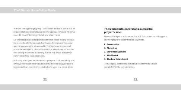 De-cluttering and clearing floor and bench space is fairly obvious . So , in addition to the presentation basics , I ’ ll be giving you some specific presentation ideas used by the top home staging and presentation experts , plus many of the proven strategies used by best selling real estate marketing Author , Ray Wood in his book : How To Sell Your Home For More .