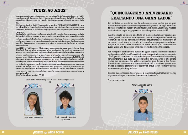 Son contadas las ocasiones que la vida nos presenta en las que un gran acontecimiento pueda conmovernos gratamente y ésta es sin lugar a duda una de ellas; el festejo de nuestro amado claustro, Fundación Colegio UIS, fundado en el año de 1970 por un grupo de reconocidos profesores de la UIS.