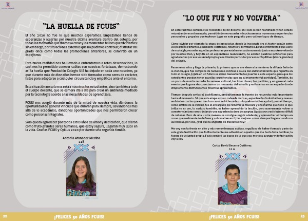 Me voy con la frente en alto y mis remembranzas activas, orgulloso de haber formado parte de esta grata institución que indirectamente me adiestró en aquello que me hacía falta dominar, la fuerza de voluntad propia. Fcuis sembró las bases de lo que soy, me toca avanzar y definir quién voy a ser.