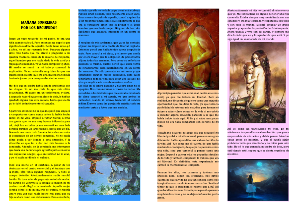 Así es como ha transcurrido mi vida. En mi adolescencia aprendí una valiosa lección: que yo era responsable de mis actos y debía pensar bien las cosas antes de hacerlas, y que sí surgía algún problema tenía que afrontarlo y no mirar para otro lado. No sé lo que pensaría mi padre de ésto, pero esté donde esté, espero que se sienta orgulloso de nosotras.