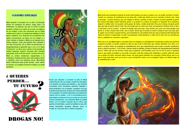 Todo esto es lo que Madi llegó a consumir antes de empezar su rehabilitación. Al principio estaba muy nerviosa y agresiva porque no podía soportar la idea de que toda la diversión que estaba teniendo esos días se le fuese a acabar. Antes de empezar la rehabilitación tuvo que ingeniárselas para poder esconder marihuana, tacaco, papel y mechero. Y así lo hizo. Cuando nadie la vigilaba, pasaba el tiempo tan tranquilamente fumando porros, sobre todo por las noches, hasta que la pillaron, y fue horrible, pero eso no fue lo peor, le quitaron todo lo que había escondido y, sin poder consumir, cada día estaba más enfadada y cuando salía del centro con el grupo las liaba. Así pasó varios meses con unas ganas horribles de consumir y hasta ahora, que no es que le vaya muy bien, pero ya va poco a poco llevándolo mejor, y ha conseguido llegar a la última etapa de la rehabilitación y todo.