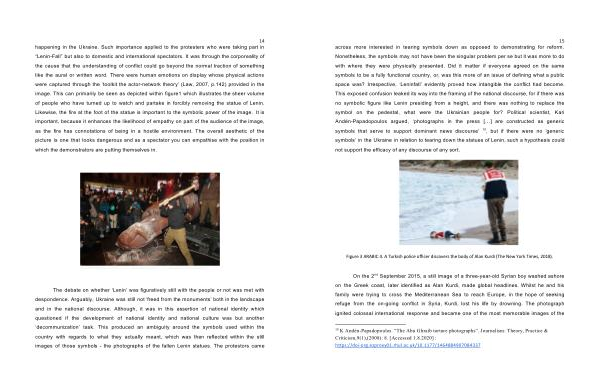 with where they were physically presented . Did it matter if everyone agreed on the same symbols to be a fully functional country , or , was this more of an issue of defining what a public space was ? Irrespective , ‘ Leninfall ’ evidently proved how intangible the conflict had become . This exposed confusion leaked its way into the framing of the national discourse , for if there was no symbolic figure like Lenin presiding from a height , and there was nothing to replace the symbol on the pedestal , what were the Ukrainian people for ? Political scientist , Kari Andén-Papadopoulos argued , ‘ photographs in the press […] are constructed as generic symbols that serve to support dominant news discourse ’ 10 , but if there were no ‘ generic symbols ’ in the Ukraine in relation to tearing down the statues of Lenin , such a hypothesis could not support the efficacy of any discourse of any sort .