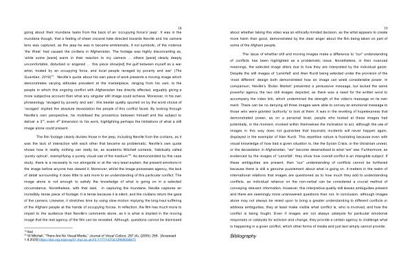 The issue of whether still and moving images make a difference to “ our ” understanding of conflicts has been highlighted as a problematic issue . Nonetheless , in their nuanced meanings , the selected image alters due to how they are interpreted by the individual gazer . Despite the still images of ‘ Leninfall ’ and Alan Kurdi being selected under the provision of the ‘ most different ’ design both demonstrated how an image can wield considerable power . In comparison , Neville ’ s ‘ Bolan Market ’ presented a persuasive message , but lacked the same powerful agency the two still images depicted , as there was a need for the written word to accompany the video link , which undermined the strength of the video ’ s message on its own merit . There can be no denying all three images were able to convey an emotional message to those who were granted ‘ authority ’ to look at them . It was in the revelling of hopelessness that demonstrated power , as on a personal level , people who looked at these images had potentially , in the moment , invoked within themselves the inclination to act , although the use of images in this way does not guarantee that traumatic incidents will never happen again , displayed in the exemplar of Alan Kurdi . This repetitive nature is frustrating because even with visual knowledge of how bad a given situation is , like the Syrian Crisis , or the Ukrainian unrest , or the devastation in Afghanistan , “ we '' become desensitised to what “ we ” see . Furthermore , as evidenced by the images of ‘ Leninfall ’, they show how overall conflict is an intangible subject . If these ambiguities are present , then “ our ” understanding of conflicts cannot be furthered because there is still a genuine puzzlement about what is going on . It matters in the realm of international relations that images are questioned as to how much they add to understanding conflicts , as individual reliance on the non-verbal can be considered a crucial method of conveying relevant information . However , this interpretive quality still leaves ambiguities present and there are seemingly more unanswered questions than not . In conclusion , although images alone may not always be relied upon to bring a greater understanding to different conflicts or address ambiguities , they at least make visible what conflict is , who is involved , and how the conflict is being fought . Even if images are not always catalysts for particular emotional responses or catalysts for activism and change , they provide a certain agency to challenge what is happening in a given conflict , which other forms of media and just text simply cannot provide .