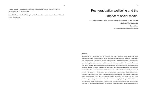 Graduating from university can be stressful for many students : uncertainty and stress surrounding career choice , financial status , and living arrangements are just some of the factors that can potentially pose mental challenges for graduates . Whilst the topic has been addressed quantitatively by academics , there is little research that looks into this topic in-depth . Therefore , this article aims to qualitatively explore how graduating from university can negatively impact students ’ mental wellbeing , whilst also considering how social media usage can contribute towards this . One-hour semi-structured interviews were conducted with a total of 9 graduates ( M = 3 , F = 6 ) aged 21 – 25 from two university institutions within North Staffordshire , United Kingdom . Participants were asked open-ended questions relating to their university experience , plans for graduation , how their university supported them after graduation , and their social media usage . Participants were recruited via a purposive sampling technique . Although this was a small-scale study , all participants shared similar experiences and thus , data saturation was reached . To generalise the findings to the wider UK student population , more research would be