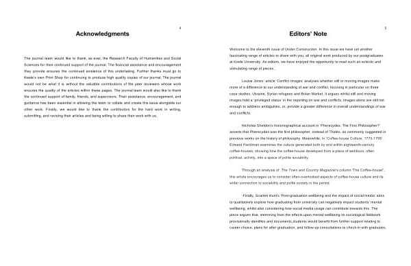 The journal team would like to thank , as ever , the Research Faculty of Humanities and Social Sciences for their continued support of the journal . The financial assistance and encouragement they provide ensures the continued existence of this undertaking . Further thanks must go to Keele ’ s own Print Shop for continuing to produce high quality copies of our journal . The journal would not be what it is without the valuable contributions of the peer reviewers whose work ensures the quality of the articles within these pages . The journal team would also like to thank the continued support of family , friends , and supervisors . Their assistance , encouragement , and guidance has been essential in allowing the team to collate and create this issue alongside our other work . Finally , we would like to thank the contributors for the hard work in writing , submitting , and revising their articles and being willing to share their work with us .