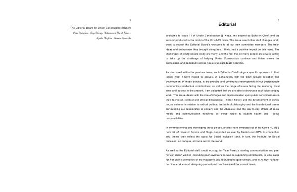 Welcome to Issue 11 of Under Construction @ Keele , my second as Editor in Chief , and the second produced in the midst of the Covid-19 crisis . This issue saw further staff changes and I want to repeat the Editorial Board ’ s welcome to all our new committee members . The fresh ideas and enthusiasm they brought along has , I think , had a positive impact on this issue . The challenges of postgraduate study are many , and the fact that so many people are always willing to take up the challenge of helping Under Construction continue and thrive shows the enthusiasm and dedication across Keele ’ s postgraduate networks .