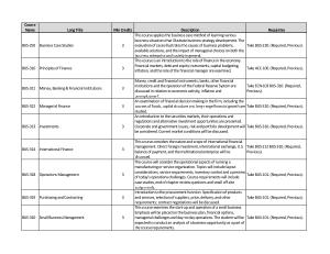 An examination of financial decision making in the firm , including the sources of funds , capital structure and long-range financial growth are Take BUS-310 . ( Required , Previous ). studied . An introduction to the securities markets , their operations and regulations and alternative investment opportunities are presented . Corporate and government issues , risk and portfolio development will Take BUS-310 . ( Required , Previous ). be considered . Current market conditions will be discussed .