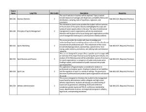 Take BUS-205 . ( Required , Previous ). for sports organizations , a comparison of public and private sector funding in sports , and investment of public resources into private sporting facilities . This application of legal principles is considered in relation to professional and amateur sports . Emphasis is placed on tort liabilities and the regulation of sport in a variety of settings . The governance Take BUS-230 . ( Required , Previous ). structure of professional and amateur sports organizations will also be discussed . This course is designed to introduce the student to the management issues faced by administrators within collegiate and high school athletics departments . Students will develop an understanding of issues such as governance , scheduling , NCAA and conference