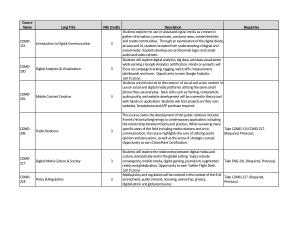 Students will explore the relationship between digital media and culture , domestically and in the global setting . Topics include convergence , mobile media , digital gaming , journalism , augmented reality and globalization . Opportunity to earn Twitter Flight Deck Certification Media policy and regulation will be covered in the context of the first amendment , public interest , licensing , ownership , privacy , digitalization and global pressures . |