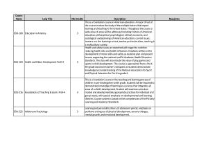Health and safety issues are examined with regard to nutrition reducing health risks and health influences . Emphasis will be on the development of motor skills and safety as students plan and present lessons supporting the national and PA Academic Health Education Standards . The class will also include the value of play , games and sports in child development . This course is approached from a Pre K - 4th grade classroom teacher ' s viewpoint as students demonstrate knowledge and understanding of the National Association for Sport and Physical Education for Pre-K to grade 4 . |