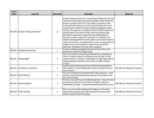 Student Teaching and Seminar is a requirement fulfilled after all other coursework requirements have been completed and the student has at least a cumulative GPA of 3.0 . The student is required to make formal application February 1st of the spring semester prior to the academic year in which the student anticipates engaging in student teaching . The experience is designed to allow for the development of professionalism in the school and the community setting , while affording the opportunity to apply teaching methodology and education concepts mastered in coursework on a daily basis . This student teaching experience is for 16 weeks in an inclusion classroom under the supervision of a certified teacher and is accompanied by a bi weekly seminar class to provide an opportunity to analyze the experience . Prerequisite : All course work completed . A review of sentence , paragraph and essay structure , this course prepares the student for college writing . This course focuses on the personal and expository components of rhetoric . Emphasis is given to writing processes and logic through constant practice in sentence combining and through organizing and styling paragraphs and themes . Peer review of student writing is included . Students explore literary genres from selected world masterpieces with emphasis on style and philosophic import and write themes of Take ENG-101 . ( Required , Previous ). critical analysis . This course emphasizes the fundamentals of play production - script selection , casting , blocking , lighting , publicity and culminates in the production of a play . This class reviews the basics of traditional grammar - classes of words and sentences , inflections and functions of English , syntactical