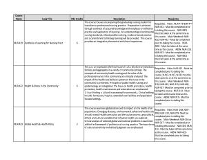 This course emphasizes the healthcare of culturally diverse individuals , Requisites : Main : NUR-319 - Must be families and aggregates in a variety of community settings . The completed prior to taking this concepts of community health nursing and the roles of the course . N 413 , N 417 , N 431 must be professional nurse in the community are critically analyzed . The taken prior to or at the same time as impact of the health care delivery system on the nurse in the this course . Main Weekend : NURcommunity is presented . Principles of public health nursing and 319 , NUR-423 , NUR-313 , NUR-460 , epidemiology are integrated . The focus on health promotion , health NUR-417- Must be completed prior to protection , health maintenance and restoration are emphasized . taking this course . NUR-413 - Must