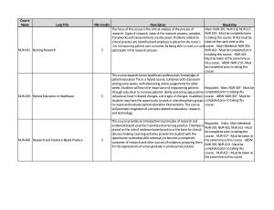 NUR-459 Patient Education in Healthcare 3 role in improving patient care outcomes by being able to read , use and participate in the research process . course . Main Weekend : NUR-319 , NUR-413 - Must be completed prior to taking this course . NUR-422 - Must be taken at the same time as this course . ABSN : NUR-319 - Must be completed prior to taking this course .