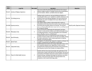 Healing involves social forces , personal attitudes and patterns of meaning which allow us to re- establish an authentic wholeness in the context of illness and suffering . Readings in the social sciences and philosophy are used to investigate these issues . ( May be taken for sociology credit .) The capstone allows students to demonstrate their mastery of philosophy by defending a thesis that examines key philosophical texts and draws upon secondary literature on the topic . The seminar ' s Take 90 credits . ( Required , Previous ). purpose is to give philosophy majors experience in presenting research in a symposium setting . This course focuses on philosophy that developed in the Italian territory . It covers ancient , medieval , and modern philosophy in Italy , including ancient Rome . It discusses philosophers such as Epictetus , Seneca , Boethius , Aquinas , and Machiavelli . The goal of this course is to understand the major principles and practices of Taoism and Zen and to see the value and viability of these principles and practices . Topics include : approaches to creativity , aesthetics and spiritual mastery . Investigation of a selected topic designed to integrate and deepen the student ' s comprehension and application of philosophy . Qualified advanced students may arrange independent study in areas not covered by existing courses . Registration is with consent of involved faculty and the permission of the Dean of Arts and Sciences , the Chairperson and the Vice President for Academic Affairs .