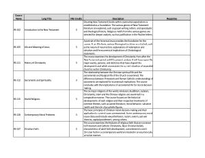 A portrait of the historical Jesus provides the foundation for the course . From this basis , various theological doctrines are studied , such as the nature of resurrection , explanations of redemption and salvation and the ecumenical implications of Christological statements . The course examines the development of Christianity from after the New Testament period until the present century . It will focus upon the major events , persons , and doctrines that have shaped this development and which also explain the current situation of separated churches within Christianity . The relationship between the Christian spiritual life and the sacramental and liturgical life of the Church is examined . The differences between Protestant and Roman Catholic understandings of sacraments are explored for ecumenical implications . The course concludes with the implications of sacramental life for moral decisionmaking . The six major religions of the world , Hinduism , Buddhism , Judaism , Christianity , Islam and the Chinese religions are examined in a comparative manner . The course focuses on the historical developments of each religion and their respective treatments of common themes , such as sacred literature , moral behavior , salvation motifs and the role of prophetic figures . The basic principles of Christian moral decision-making and their application to current issues are examined . Some contemporary moral issues discussed include sexual behavior , racism , sexism , just war theories , capital punishment , among others . This course examines the features of religious faith that are common to Protestant and Catholic Christianity . Basic Christian beliefs , characteristics of adult faith development , commitment to one ' s Christian faith in a contemporary world are treated in an ecumenically sensitive manner .