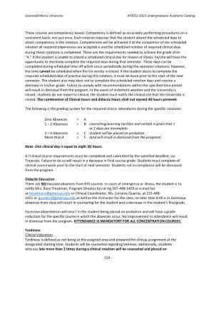 These courses are competency-based . Competency is defined as accurately performing procedures on a consistent basis , not just once . Each rotation requires that the student attend the scheduled days to attain competency in the rotation . Competencies will be achieved if at the completion of the scheduled rotation all required experiences are acceptable and the scheduled number of required clinical days during these rotations is completed . These are the requirements needed to achieve the grade of an “ A .” If the student is unable to attend a scheduled clinical day for reason of illness , he / she will have the opportunity to electively complete the required days during that semester . These days can be completed during scheduled time off which occur periodically during the semester rotations ; however , the time cannot be scheduled when the University is closed . If the student elects to complete the required scheduled days of practice during this rotation , it must be done prior to the start of the next semester . The student also may elect not to complete the scheduled rotation days and receive a decrease in his / her grade . Failure to comply with recommendations within the specified time period will result in dismissal from the program . In the event of inclement weather and the University is closed , students do not report to clinical , the student must notify the clinical site that the University is closed . The combination of Clinical hours and didactic hours shall not exceed 40 hours perweek .