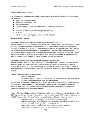 For Students Transferring to the BSN Program from Other Nursing Programs Students applying to this BSN program who may have taken nursing courses at another institution , may be able to transfer some courses ( if they achieve a " C " or higher and the courses are comparable in content and credit value ) to facilitate movement into the Gwynedd Mercy University Nursing Program . The student may be asked to challenge the Gwynedd Mercy University course content through examination to validate if he / she has the comparable course content . All nursing courses from another nursing program will be evaluated on an individual basis . Admission procedures as stated previously apply for these students . A minimum earned 3.0 GPA is required for admission .
