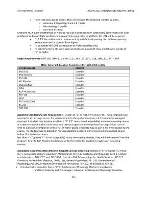 • Have received a grade no less than a B minus in the following transfer courses : . o Anatomy & Physiology I and II 8 credits o Microbiology 3 credits o Nutrition 3 credits Credit for NUR 209 Fundamentals of Nursing Practice is contingent on satisfactory performance on a lab practicum to demonstrate proficiency in required nursing skills . In addition , the LPN will be required