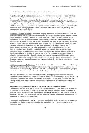 Cognitive , Conceptual , and Quantitative Abilities : The individual must be able to develop and refine problem-solving skills that are crucial to practice as a nurse . Problem-solving involves the abilities to measure , calculate , reason , analyze , and synthesize objective and subjective data , and to make decisions , often in a time urgent environment , that reflect consistent and thoughtful deliberation and sound clinical judgment . Each individual must demonstrate mastery of these skills and possess the ability to incorporate new information from peers , teachers , and the nursing and medical literature to formulate sound clinical judgment in patient assessment , intervention , evaluation , teaching , and setting short- and long-term goals .