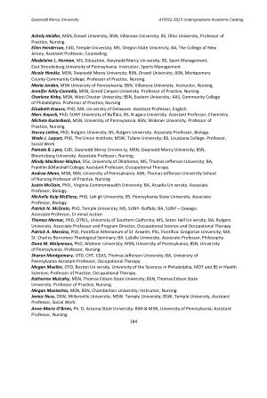 Ashely Heidler , MSN , Drexel University ; BSN , Villanova University ; BS , Ohio University , Professor of Practice , Nursing . Ellen Henderson , EdD , Temple University ; MS , Oregon State University , BA , The College of New Jersey , Assistant Professor , Counseling . Madeleine L . Herman , MS , Education , Gwynedd Mercy University ; BS , Sport Management , East Stroudsburg University of Pennsylvania . Instructor , Sports Management . Nicole Hinckle , MSN , Gwynedd Mercy University ; BSN , Drexel University ; ASN , Montgomery County Community College . Professor of Practice , Nursing . Maria Jordan , MSN University of Pennsylvania ; BSN , Villanova University . Instructor , Nursing . Jennifer Kelly-Connolly , MSN , Grand Canyon University . Professor of Practice , Nursing . Charlene Kirby , MSN , West Chester University ; BSN , Eastern University ; AAS , Community College of Philadelphia . Professor of Practice , Nursing Elizabeth Knauss , PhD , MA , University of Delaware . Assistant Professor , English . Marc Koyack , PhD , SUNY University of Buffalo ; BS , Niagara University . Assistant Professor , Chemistry . Michele Kusterbeck , MSN , University of Pennsylvania . BSN , Widener University . Professor of Practice , Nursing . Stacey Lettini , PhD , Rutgers University ; BS , Rutgers University . Associate Professor , Biology . Wade J . Luquet , PhD , The Union Institute ; MSW , Tulane University ; BS , Louisiana College . Professor , Social Work . Pamela B . Lynn , EdD , Gwynedd Mercy University , MSN , Gwynedd Mercy University ; BSN , Bloomsburg University . Associate Professor , Nursing . Mindy MacRone-Wojton , DSc , University of Oklahoma ; MS , Thomas Jefferson University ; BA , Franklin & Marshall College ; Assistant Professor , Occupational Therapy . Andrea Mann , MSN , BSN , University of Pennsylvania . ASN , Thomas Jefferson University School of Nursing Professor of Practice , Nursing Justin McClain , PhD ., Virginia Commonwealth University ; BA , Arcadia University . Associate Professor , Biology . Michelle Kulp McEliece , PhD , Lehigh University ; BS , Pennsylvania State University . Associate Professor , Biology . Patrick N . McGrain , PhD , Temple University ; MS , SUNY- Buffalo ; BA , SUNY – Oswego . Associate Professor , Criminal Justice . Thomas Mernar , PhD , OTR / L , University of Southern California ; MS , Seton Hall University ; BA , Rutgers University . Associate Professor and Program Director , Occupational Science and Occupational Therapy Patrick A . Messina , PhD , Pontifical Athenaeum of St . Anselm ; PhL , Pontifical Gregorian University ; MA , St . Charles Borromeo Theological Seminary ; BA , LaSalle University . Associate Professor , Philosophy . Dona M . Molyneaux , PhD , Widener University ; MSN , University of Pennsylvania ; BSN , University of Pennsylvania . Professor , Nursing . Sharon Montgomery , OTD , CHT , CEAS , Thomas Jefferson University ; BA , University of Pennsylvania Assistant Professor , Occupational Therapy . Megan Mueller , OTD , Boston University . University of the Sciences in Philadelphia , MOT and BS in Health Sciences ; Professor of Practice , Occupational Therapy . Katherine Mulcahy , MSN , Thomas Edison State University ; BSN , Thomas Edison State University . Professor of Practice , Nursing . Megan Mustachio , MSN , BSN , Chamberlain University ; Instructor , Nursing . Janice Nuss , DSW , Millersville University ; MSW , Temple University ; BSW , Temple University . Assistant Professor , Social Work . Anne-Marie O ’ Brien , Ph . D , Arizona State University ; BSN & MSN , University of Pennsylvania ; Assistant Professor , Nursing