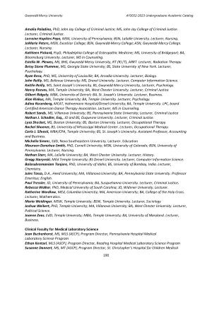 Amalia Paladino , PhD , John Jay College of Criminal Justice ; MS , John Jay College of Criminal Justice . Lecturer , Criminal Justice . Lorraine Hopkins Pepe , MSN , University of Pennsylvania ; BSN , LaSalle University . Lecturer , Nursing . JoMarie Peters , MSN , Excelsior College ; BSN , Gwynedd-Mercy College ; ASN , Gwynedd-Mercy College . Lecturer , Nursing . Kathleen Pickard , PsyD , Philadelphia College of Osteopathic Medicine ; MS , University of Bridgeport ; BA , Bloomsburg University . Lecturer , MS in Counseling . Estella W . Plewes , MS , BHS , Gwynedd Mercy University , RT ( R ) ( T ), ARRT . Lecturer , Radiation Therapy . Betsy Stone Plummer , MS , Georgia State University ; BS , State University of New York . Lecturer , Psychology . Ryan Reca , PhD , MS , University of Louisville ; BA , Arcadia University . Lecturer , Biology . John Reilly , MS , Bellevue University ; MS , Drexel University . Lecturer , Computer Information Science . Kaitlin Reilly , MS , Saint Joseph ’ s University , BS , Gwynedd Mercy University , Lecturer , Psychology . Nancy Reeves , MA , Temple University ; BA , West Chester University . Lecturer , Criminal Justice . Gilbert Ridgely , MBA , University of Detroit ; BA , St . Joseph ' s University . Lecturer , Business . Alan Rinkus , MA , Temple University ; BA , Temple University . Lecturer , Psychology . Adina Rosenberg , MCAT , Hahnemann Hospital / Drexel University ; BA , Temple University . LPC , board Certified American Dance Therapy Association . Lecturer , MS in Counseling . Robert Sands , MS , Villanova University ; BS , Pennsylvania State University ; Lecturer , Criminal Justice Nathan J . Schadler , Esq ., JD and BS , Duquesne University . Lecturer , Criminal Justice . Lysa Shocket , MS , Boston University ; BS , Boston University . Lecturer , Occupational Therapy . Rachel Shoener , BS , University of Mississippi Medical Center . Lecturer , Occupational Therapy . Carlo J . Silvesti , MBA / CPA , Temple University ; BS , St . Joseph ’ s University . Assistant Professor , Accounting and Business . Michelle Simms , EdD , Nova Southeastern University . Lecturer . Education Maureen Donohue-Smith , PhD , Cornell University ; MSN , University of Colorado ; BSN , University of Pennsylvania . Lecturer , Nursing . Nathan Starr , MA , LaSalle University ; BA , West Chester University . Lecturer , History . Gregg Starynski , MEd Temple University ; BS Drexel University . Lecturer , Computer Information Science . Balasubramaniam Tanjore , PhD , University of Idaho ; BS , University of Bombay , India . Lecturer , Chemistry . Jules Tasca , D . A ., Heed University ; MA , Villanova University ; BA , Pennsylvania State University . Professor Emeritus ; English . Paul Tressler , JD , University of Pennsylvania ; BA , Susquehanna University . Lecturer , Criminal Justice . Rebecca Walker , PhD , Medical University of South Carolina ; JD , Widener University . Lecturer . Katherine Wardlow , MEd , Columbia Universtiy ; MA , American University ; BA , College of the Holy Cross . Lecturer , Mathematics . Maria Weidinger , MSW , Temple University ; BSW , Temple University . Lecturer , Sociology Joshua Weikert , PhD , Temple University ; MA , Villanova University ; BA , West Chester University . Lecturer , Political Science . Joanne Zeas , EdD , Temple University ; MBA , Temple University ; BA , University of Maryland . Lecturer , Business .