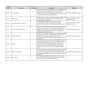 Principals involved in establishing an accounting information system included are source documents , internal control , and the interfaces needed for managerial control of the business . The integration of managerial accounting , information needs with the design and implementation of systems is studied . This course includes a series of discrete topics not previously included in other courses plus topics considered in greater depth here than in previous courses . Included are GAAP accounting , business combinations , government accounting , foreign currency translation and derivatives . A study and critical appraisal of current auditing standards related to the examination of financial statements by an independent auditor for both public and privately owned businesses . The course also applies many of the same auditing techniques to discover fraud , through the use of case studies , exploring the moral and ethical problems and issues of the accountant in auditing and detecting fraud . This course will pursue further complex accounting issues not covered in previous courses . Topics will include : GAAP and IFRS handling of international currency transactions , fiduciary accounting , including both bankruptcy and estates and trusts , and accounting for non-profit organizations . This course provides opportunity to research a current accounting issue under GAAP or IFRS , comparing and contrasting the handling and application of the account theory and practice .