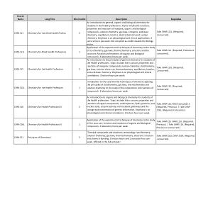 An introduction to general , organic and biological chemistry for students in the health professions . Topics include the structure , properties and reactions of inorganic , organic and biological compounds , solution chemistry , gas laws , energetic , acid-base chemistry , equilibrium , kinetics , electrochemistry and nuclear chemistry . Emphasis is on physiological and clinical applications . 3 lecture hours per week . Not accepted as credit towards the biology major . |
