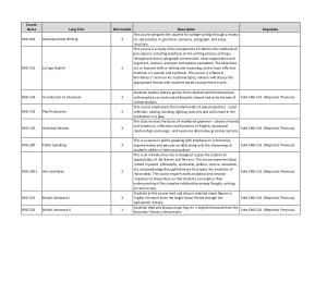 Students explore literary genres from selected world masterpieces with emphasis on style and philosophic import and write themes of Take ENG-101 . ( Required , Previous ). critical analysis . This course emphasizes the fundamentals of play production - script selection , casting , blocking , lighting , publicity and culminates in the production of a play . This class reviews the basics of traditional grammar - classes of words and sentences , inflections and functions of English , syntactical
