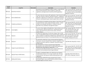 Take 1 group ( Take MTH-141 MTH-142 MTH-231 MTH-234 or MTH-261 ; Minimum grade D- / Take MTH- TESTL5 ). ( Required , Previous ).