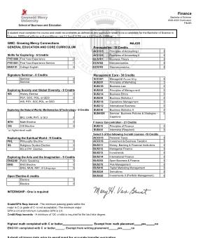 A student must complete the course and credit requirements as defined on this curriculum sheet to be a candidate for the Bachelor of Science in Finance . Additional policies and procedures may be found in the current University Catalog .