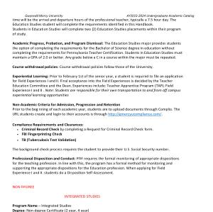 Academic Progress , Probation , and Program Dismissal : The Education Studies major provides students the option of completing the requirements for the Bachelor of Science degree in education without completing the requirements for Pennsylvania Teacher Certification . Students in Education Studies must maintain a GPA of 2.0 or better . Any grade below a C in a course within the major must be repeated .