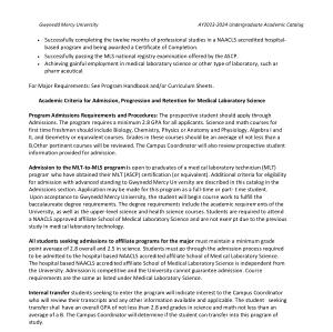 For Major Requirements : See Program Handbook and / or Curriculum Sheets . Academic Criteria for Admission , Progression and Retention for Medical Laboratory Science