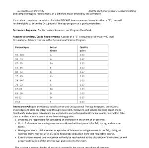 Academic Standards / Grade Requirements : A grade of a “ C ” is required of all major 400 level Occupational Science courses in the Occupational Science Program .