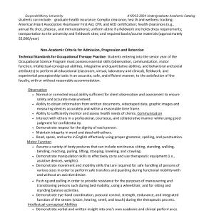 Technical Standards for Occupational Therapy Practice : Students entering into the senior year of the Occupational Science Program must possess essential skills ( observation , communication , motor function , intellectual-conceptual abilities , integrative and quantitative abilities , and behavioral and social attributes ) to perform all educational ( classroom , virtual , laboratory and clinical ), fieldwork , and experiential preceptorship tasks in an accurate , safe , and efficient manner , to the satisfaction of the faculty , with or without reasonable accommodation .