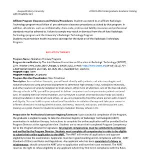Affiliate Program Clearances and Policies / Procedures : Students accepted to an affiliate Radiologic Technology program must follow all pre-admission clearance procedures as stated by that program . In addition , all policies , such as confidentiality , dress code , professional liability insurance and professional standards must be adhered to . Failure to comply may result in dismissal from the affiliate Radiologic Technology program and the University ’ s Radiologic Technology Program . Students must maintain health insurance coverage for the duration of the Radiologic Technology Program .