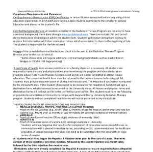 A certificate of health from a nurse practitioner or a family physician is necessary . All students are required to have a history and physical done prior to entering the program and clinical education . Students whose History and Physical Record are not on file will not be permitted to attend clinical education . The completed health form must be returned to the University nurse before August 1st . Students must provide documentation of all required inoculations . The Hepatitis B vaccination is required by the clinical affiliates . If the student chooses not to be inoculated for Hepatitis B , he / she must sign a declination form , which also must be returned to the University nurse . All history and physical forms and declination forms will be kept on file in the University nurse ’ s office . The student must have the following or provide documentation of immunity to comply with Gwynedd Mercy University Radiation Therapy program . Students without completed health forms will not be permitted in any clinical site .