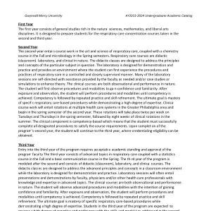 Second Year The second-year entails course work in the art and science of respiratory care , coupled with a chemistry course in the Fall and microbiology in the Spring semesters . Respiratory care courses are didactic ( classroom ), laboratory , and clinical in nature . The didactic classes are designed to address the principles and concepts of the particular subject in question . The laboratory is designed for demonstration and practice and provides an environment where the student can first experience the procedures and practices of respiratory care in a controlled and closely supervised manner . Many of the laboratory sessions are self-directed with assistance provided by the faculty as needed and / or case studies or simulations to enhance theory . The clinical courses are both observational and performance in nature . The student will first observe procedures and modalities to gain confidence and familiarity . After exposure and observation , the student will perform procedures and modalities until competency is achieved . Competency is followed by repeated practice and skill refinement . The ultimate goal is mastery of specific respiratory care-based procedures while demonstrating a high degree of expertise . Clinical course work will entail rotations at multiple health care systems in the Greater Philadelphia area and begin in the spring semester of the second year . These rotations will take place twice per week on Tuesdays and Thursdays in the spring semester , followed by eight weeks of clinical rotations in the summer . The clinical component is competency-based which means that the student must successfully complete all designated procedures to satisfy the course requirements . Upon completion of the program ' s second year , the student will continue to the third year , where credentialing-eligibility can be obtained .