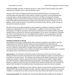 The goal of the Frances M . Maguire School of Nursing and Health Professions is to prepare every Distinctive Mercy Nursing student to think ethically , critically , and practice nursing competently and compassionately in rapidly changing practice environments . All efforts are designed to facilitate knowledge , enhance nursing practice and patient safety , foster professional integrity , and ultimately improve the health outcomes of patients , families , and communities across the continuum of care . In addition , certain functional abilities are essential for the delivery of safe , effective , quality nursing care during clinical education activities .