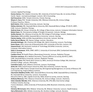 Lecturer , Applied Psychology . Denise Horton , PhD , Walden University : MS , University of Central Texas ; BA , University of Mary Hardin- Baylor . Licensed psychologist . Lecturer , MS in Counseling . Gail Houseman , MSN , Temple University . Clinical , Nursing . Wayne A . Huss , PhD , Temple University ; MA , Villanova University ; BA , Ursinus College . Professor Emeritus , History . Beth Hutter , MSN , Indiana University , Lecturer , Nursing . Shirley Johnston , MS , Gwynedd Mercy University ; BHS , Gwynedd Mercy College . RT ( R ) ( T ), ARRT , CMD . Lecturer , Radiation Therapy . Andrew Kane , MS , Strayer University , BS , College of New Jersey , Lecturer , Computer Information Science . Robert Kane , DC , Pennsylvania College of Straight Chiropractic . Lecturer , Biology . Anitha Kannan , MS , Villanova University , BS , PSG College of Technology . Lecturer , Mathematics . Claire Karis , MSN and BSN , Gwynedd Mercy University . Lecturer , Nursing Patricia Keeley , MSN and BSN , Gwynedd Mercy University . Lecturer , Nursing . Kathy Kersul-Wiener , ME , Beaver College . Lecturer . Education . Amanda Kettinger , MS , Chestnut Hill College , BA , Cabrini University , Lecturer , Psychology . Karen Kieser , MFA , University of Massachusetts ; BFA , University of the Arts . Lecturer , Art . Howard Knorr , MS , Rochester Institute of Technology ; BS Wilkes University . Lecturer , Computer Information Science Kelly A . Kronemeyer , MSN , CRNP , AGPC-C , University of Cincinnati ; BSN , Cumberland University . Clinical , Nursing . Candace Krout , BS Health Physics , Bloomsburg University . Lecturer , Radiation Therapy . Christine Lawrence , BS in Medical Dosimetry , Thomas Jefferson University ; BS RT ( T ), AART , CMD , Gwynedd Mercy University . Lecturer , Radiation Therapy . Timothy K . Lent , PhD , North-West University ; DMin , American Christian College ; MA , American Christian College . Lecturer , Philosophy . Carmelina Lewis , PsyD , Widener University . Lecturer , Psychology . Anita Litz- MSN , Grand Canyon University ; BSN , Ohio University . Lecturer , Nursing . Greg Lucado , MBA Finance Temple University ; MS Engineering Management , University of Missouri ; BS Civil Engineering , Virginia Military Institute , Charmaine Maddrey-Smith , MBA , Gwynedd Mercy University , MSM , Gwynedd Mercy University , BS , Gwynedd Mercy University . Lecturer , Accounting . Maryanne Malloy , DNP , Capella University , MSN , Drexel University , Lecturer , Nursing . Anthony Mancuso , PhD , Villanova University ; BS , Ursinus College . Lecturer , Chemistry . Velia Colombo McCabe , MSN , Villanova University ; RN , CPN , BSN , Holy Family College . Professor Emerita , Nursing . Frances McAdams , MSN , University of Pennsylvania , BSN , Neumann University , Lecturer , Nursing . Christina McCormack , MEd , Widener University ; BS , Widener University . Lecturer , Health Science . Harry McConnell , MBA , DeSales University ; BA , Stockton College . Lecturer , Business . Hilary McManamon , MSN , Excelsior , Lecturer Ann Metcalf , MA , Villanova University ; BA , Hood College , The Pennsylvania State Police Academy . Lecturer , Psychology . Edward Miller , PhD , University of Louvain ; MA , St . Stephens Institute of Philosophy ; BA , Providence College . Professor Emeritus , Religious Studies . Tahara Muhammad , MBA , Arcadia University ; BS , Gwynedd Mercy University ; AS , Gwynedd Mercy University . Lecturer , Business . Marshall Murdaugh , MS , Wilmington University ; BS , Central Washington University . Lecturer , Business .