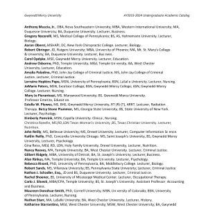 Anthony Muscia , Jr ., DBA , Nova Southeastern University ; MBA , Western International University ; MA , Duquesne University ; BA , Duquesne University . Lecturer , Business . Gregory Nacarelli , MS , Medical College of Pennsylvania ; BS , AS , Hahnemann University . Lecturer , Biology . Aaron Oberst , MSHAPI , DC , New York Chiropractic College . Lecturer , Biology . Robert Obringer , JD , Rutgers University ; MBA , University of Phoenix ; MA , Mt . St . Mary ' s College & University ; BA , Duquesne University . Lecturer , Business . Carol Opdyke , MSE , Gwynedd Mercy University . Lecturer , Education . Andrew Osborne , PhD , Temple University ; MEd , Temple University ; BA , West Chester University . Lecturer , Education . Amalia Paladino , PhD , John Jay College of Criminal Justice ; MS , John Jay College of Criminal Justice . Lecturer , Criminal Justice . Lorraine Hopkins Pepe , MSN , University of Pennsylvania ; BSN , LaSalle University . Lecturer , Nursing . JoMarie Peters , MSN , Excelsior College ; BSN , Gwynedd-Mercy College ; ASN , Gwynedd-Mercy College . Lecturer , Nursing . Mary Jo Pierantozzi , MS , Marywood University ; BS , Gwynedd Mercy University . Professor Emerita , Education . Estella W . Plewes , MS , BHS , Gwynedd Mercy University , RT ( R ) ( T ), ARRT . Lecturer , Radiation Therapy . Betsy Stone Plummer , MS , Georgia State University ; BS , State University of New York . Lecturer , Psychology . Kimberly Pomrink , MSN , Capella University . Clinical , Nursing . Christina Ranelle , MS , RD , LDN Texas Woman ’ s University , BS , Texas Christian University . Lecturer , Nutrition . John Reilly , MS , Bellevue University ; MS , Drexel University . Lecturer , Computer Information Science . Kaitlin Reilly , PhD , Concordia University Chicago . MS , Saint Joseph ’ s University , BS , Gwynedd Mercy University . Lecturer , Psychology . Gina Reiss , MEd , RD , LDN , Holy Family University , Drexel University , Lecturer , Nutrition . Nancy Reeves , MA , Temple University ; BA , West Chester University . Lecturer , Criminal Justice . Gilbert Ridgely , MBA , University of Detroit ; BA , St . Joseph ' s University . Lecturer , Business . Alan Rinkus , MA , Temple University ; BA , Temple University . Lecturer , Psychology . Rebecca Rivard , PhD , University of Pennsylvania , BA , Middlebury College . Lecturer , Biology . Robert Sands , MS , Villanova University ; BS , Pennsylvania State University ; Lecturer , Criminal Justice Nathan J . Schadler , Esq ., JD and BS , Duquesne University . Lecturer , Criminal Justice . Rachel Shoener , BS , University of Mississippi Medical Center . Lecturer , Occupational Therapy . Carlo J . Silvesti , MBA / CPA , Temple University ; BS , St . Joseph ’ s University . Assistant Professor , Accounting and Business . Maureen Donohue-Smith , PhD , Cornell University ; MSN , University of Colorado ; BSN , University of Pennsylvania . Lecturer , Nursing . Nathan Starr , MA , LaSalle University ; BA , West Chester University . Lecturer , History . Katharine Starrantino , MEd , West Chester University ; MSW , West Chester University ; BA , Gwynedd Mercy College . LCSW . Lecturer , Psychology . Gregg Starynski , MEd Temple University ; BS Drexel University . Lecturer , Computer Information Science . Balasubramaniam Tanjore , PhD , University of Idaho ; BS , University of Bombay , India . Lecturer , Chemistry . Jules Tasca , D . A ., Heed University ; MA , Villanova University ; BA , Pennsylvania State University . Professor Emeritus ; English . Paul Tressler , JD , University of Pennsylvania ; BA , Susquehanna University . Lecturer , Criminal Justice .