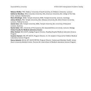 Rebecca Walker , PhD , Medical University of South Carolina ; JD , Widener University . Lecturer . Katherine Wardlow , MEd , Columbia University ; MA , American University ; BA , College of the Holy Cross . Lecturer , Mathematics . Maria Weidinger , MSW , Temple University ; BSW , Temple University . Lecturer , Sociology Joshua Weikert , PhD , Temple University ; MA , Villanova University ; BA , West Chester University . Lecturer , Political Science . Joanne Zeas , EdD , Temple University ; MBA , Temple University ; BA , University of Maryland . Lecturer , Business . Rachel Zobel , MES , University of Pennsylvania ; BS , Gwynedd Mercy University . Lecturer , Biology . Clinical Faculty for Medical Laboratory Science Ethan Kentzel , MLS ( ASCP ), Acting Program Director , Reading Hospital Medical Laboratory Science Program Susanne Dannert , MS , MT ( ASCP ), Program Director , St . Christopher ’ s Hospital for Children Medical Laboratory Science Program Nancy Jalowski , MA Ed , MT ( ASCP ) PBTCM , Program Director , Hackensack Meridian Health , Jersey Shore University Medical Center , Florence M . Cook School of Medical Laboratory Science Program