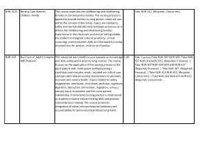 5.00 Take 1 group ( Take NUR-307 NUR-324 / Take NUR- 307 NUR-314 NUR-315 ). ( Required , Previous ). | Take NUR-307 NUR-324 NUR-316 NUR-317 . ( Required , Previous ). | Take NUR-307 . ( Required , Previous ). | Take NUR-313 NUR-423 . ( Required , Concurrent ). | Take NUR-316 NUR-417 NUR-413 . ( Required , Concurrent ).