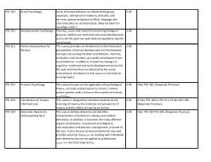 This course is designed to introduce students to the meaning of trauma , the incidence and prevalence of trauma and the effects of trauma on human This course defines dementia and identifies characteristics of Alzheimer ' s disease and related dementias . In addition , it examines the many different aspects of dementia : assessment and diagnosis , communication and behavior management , and end-oflife care . It also , focuses on best practices for care and provides practical resources for working with individuals with dementia that can be applied to professional careers in the field of geriatrics .