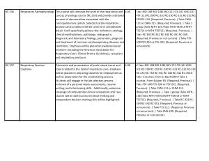4.00 # Take BIO-108 BIO-108L BIO-121 CIS-101 ENG- 101 RC-200 RC-210 RC-230 RC-231 RC-232 RC-233 RC-234 RC-330 RC-331 RC-340 RC-341 RC-350 # Take 1 courses ; From Subject SEM # Take 1 courses ; From Subject RS . ( Required , Previous ). | Take PSY-100 PSY-200 or PSY-202 . ( Required , Previous ). | Take CHM-111 or CHM-115 . ( Required , Previous ). | Take 1 group ( Take MTH- 136 / Take MTH-TESTL3 MTH-TESTL4 or MTH- TESTL5 ). ( Required , Previous ). | Take RC-332 RC- 334 RC-342 RC-351 . ( Required , Previous or concurrent ). | Take PSY-111 . ( Required , Previous or concurrent ). | Take ENG-200 . ( Required , Previous or concurrent ). |