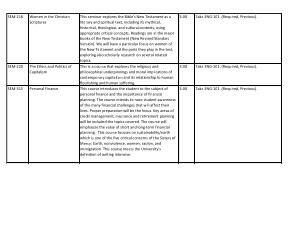 This seminar explores the Bible ' s New Testament as a literary and spiritual text , including its mythical , historical , theological , and cultural contexts , using appropriate critical concepts . Readings are in the major books of the New Testament ( New Revised Standard Version ). We will have a particular focus on women of the New Testament and the parts they play in the text , exploring also scholarly research on several related topics . This is a course that explores the religious and philosophical underpinnings and moral implications of contemporary capitalism and its relationship to human flourishing and human suffering .