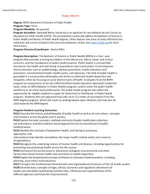 Program Description : The Bachelor of Science in Public Health ( BSPH ) is a four- year program that provides a strong foundation in the liberal arts , Mercy values and critical concerns , and the foundations of public health practice . Public health is a broad field focused on the health and well-being of populations and communities . It encompasses diverse domains such as epidemiology , disease prevention , health education and promotion , environmental health , health policy , and advocacy . The field of public health is grounded in a social justice philosophy and strives to eliminate health disparities and inequities , often by focusing on social determinants of health . Graduates from the BSPH program are prepared to sit for the CHES ( Certified Health Education Specialist ) credential exam , enter an MPH ( Master in Public Health ) program , and / or enter the public health workforce as an entry-level professional . The public health program also offers the opportunity for eligible students to apply for Early Entry to the Master in Public Health program . Students who are approved may take up to 12 credits of coursework from the MPH degree program , which will count as undergraduate open electives and may also be used towards the MPH degree .
